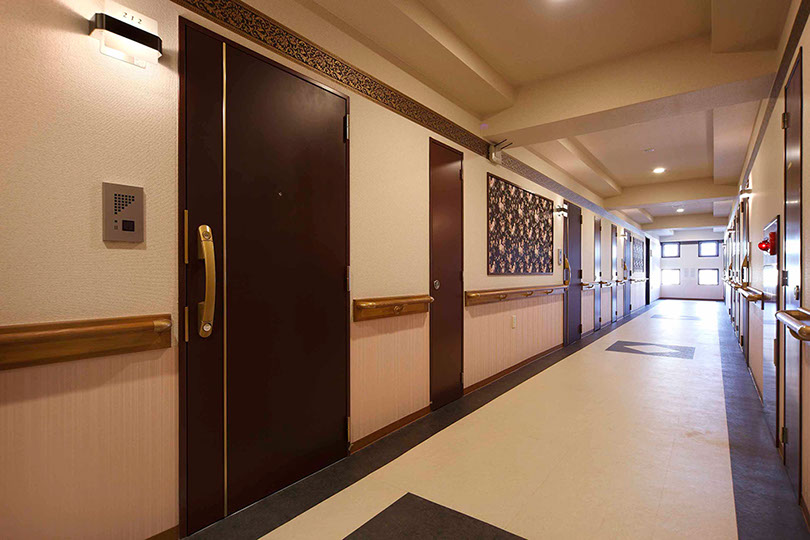 来訪者は、フロントを通り入館するシステム。館内には、24時間スタッフが常駐しております。ご入居者の安全をお守りします。
